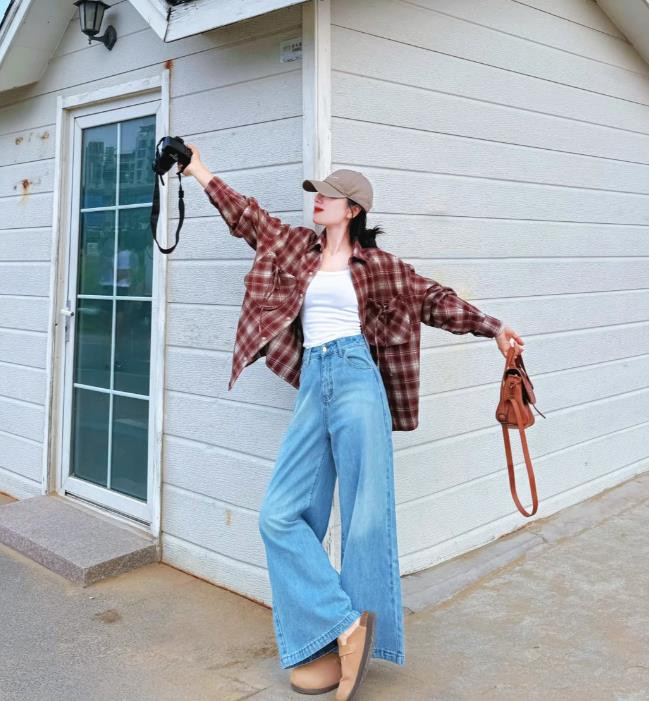 现在很多女性们都喜欢随性自在的休闲穿搭了,这样的穿搭无论是日常出街,还是度假都是很合适的。红棕色格纹衬衫,宽松的版型,秋天直接拿来当外套穿,格纹元素复古气息满满,也为整个穿搭增加了文艺气息,内搭白色背心,适当进行了提亮,搭配浅蓝色牛仔阔腿裤,很是洒脱舒适的一套。