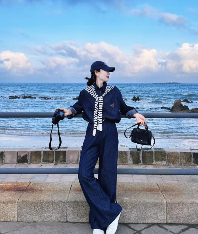 对于不懂搭配,或者是不想花费太多心思在搭配上的姐妹,就可以直接选择套装来穿,省心又不会出错。这一套牛仔套装,看着就很休闲又不失精致,上衣是一件翻领牛仔衬衫,下装是牛仔阔腿裤,宽松的版型给足了身材包容性,利用黑白条纹针织作为披肩,为整个造型增添了层次感,尽显时尚。