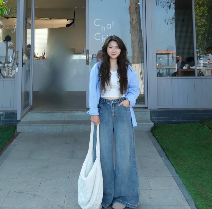 这一套清新随性的休闲风穿搭,喜欢的就借鉴起来吧,十分适合出街、咖啡厅聚会等场合,浅蓝色条纹衬衫内搭短款白色背心,稍微露出腰线,既显得利落,又多了几分清爽。宽松的版型,更是营造出随性慵懒,下装搭配深蓝色牛仔阔腿裤,宽大的裤型很好修饰腿部线条,还自带洒脱不羁,选择一双浅色鞋子来配,与整体的配色组合一起很和谐。
