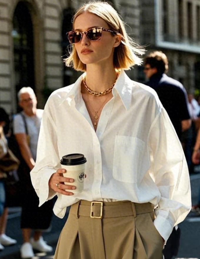 很适合职场通勤的一套穿搭,简约却不失高级感,白色衬衫,版型是相对宽松的,这样的款式就不容易穿出过分正式与严谨,秋天的时候建议叠穿,微微露出内搭,增添几分慵懒与随性,再搭配一条深灰色高腰阔腿裤,高腰的设计,加上腰带点缀,利落又拉长身材比例。