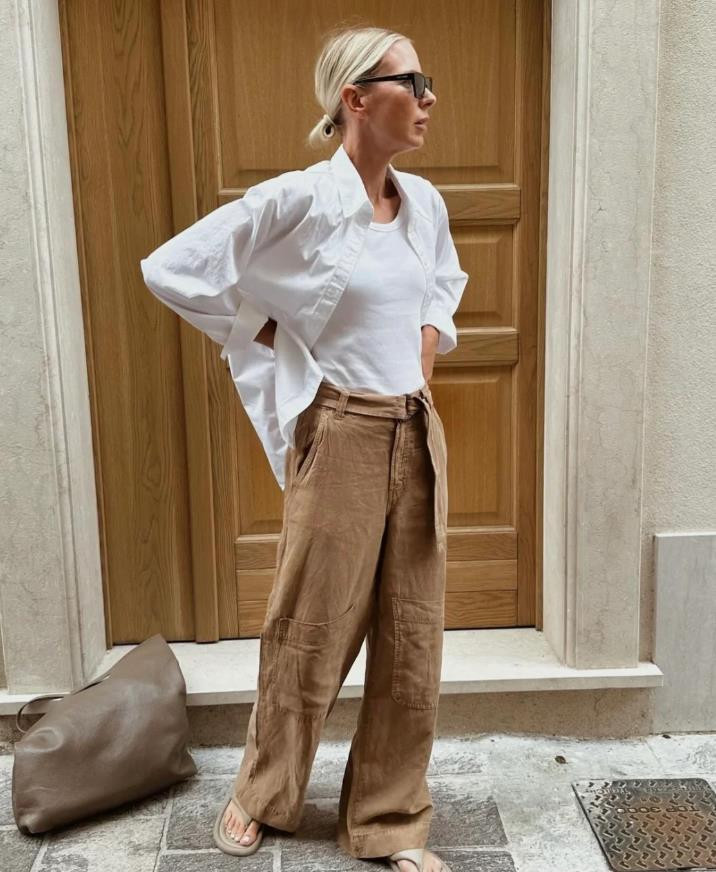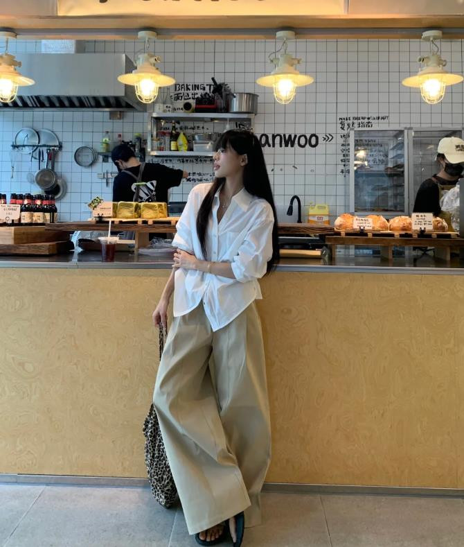 衬衫与阔腿裤的搭配,凭借着利落与松弛的氛围感,适用场合还是比较广泛的,不管是日常休闲,还是职场亦或者是轻正式的场合都可以驾驭。