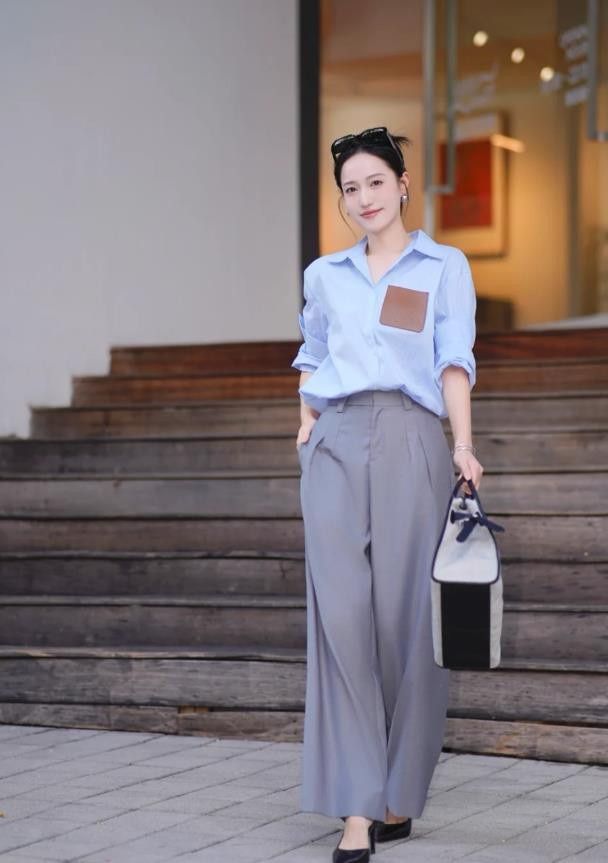 浅浅的蓝色衬衫,很喜欢这个色调,清爽干净又给人很舒适的感觉,胸前棕色贴布的设计,增添了设计感,它的版型是宽松的,袖子稍微挽起来一些,就能营造出随性范。搭配浅灰色西装阔腿裤,垂坠感十足的面料,加上宽松的裤腿,很好修饰了腿型,还带来几分洒脱随性的范。