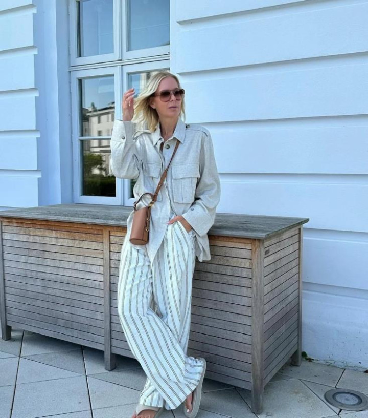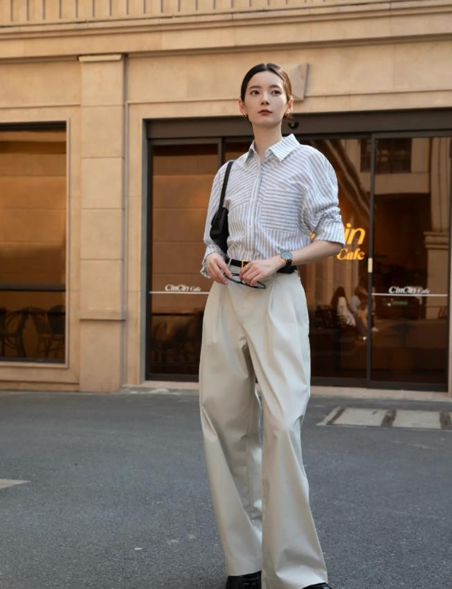 如果你觉得纯色系的衬衫看起来太单调,那么就试试这种条纹的吧,蓝白相间条纹衬衫,经典的元素很耐看百搭,还带着几分清新气息,记得要把袖口稍微挽起来,这样显得更随性自在。下装搭配浅米色阔腿裤,宽大的裤腿不仅修饰腿型,还展现出洒脱的格调,脚上穿上一双黑色鞋子,与整体的风格很契合。
